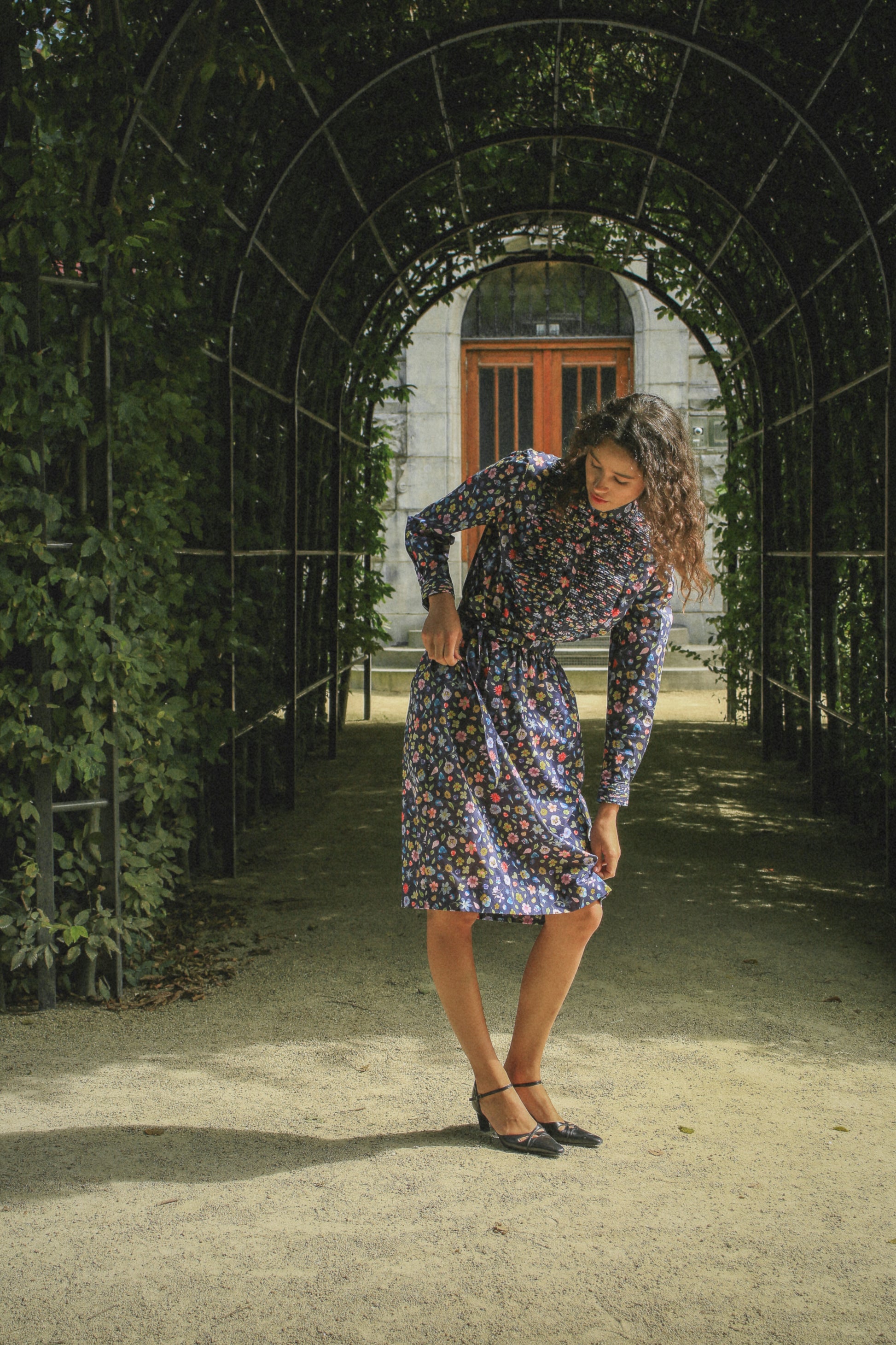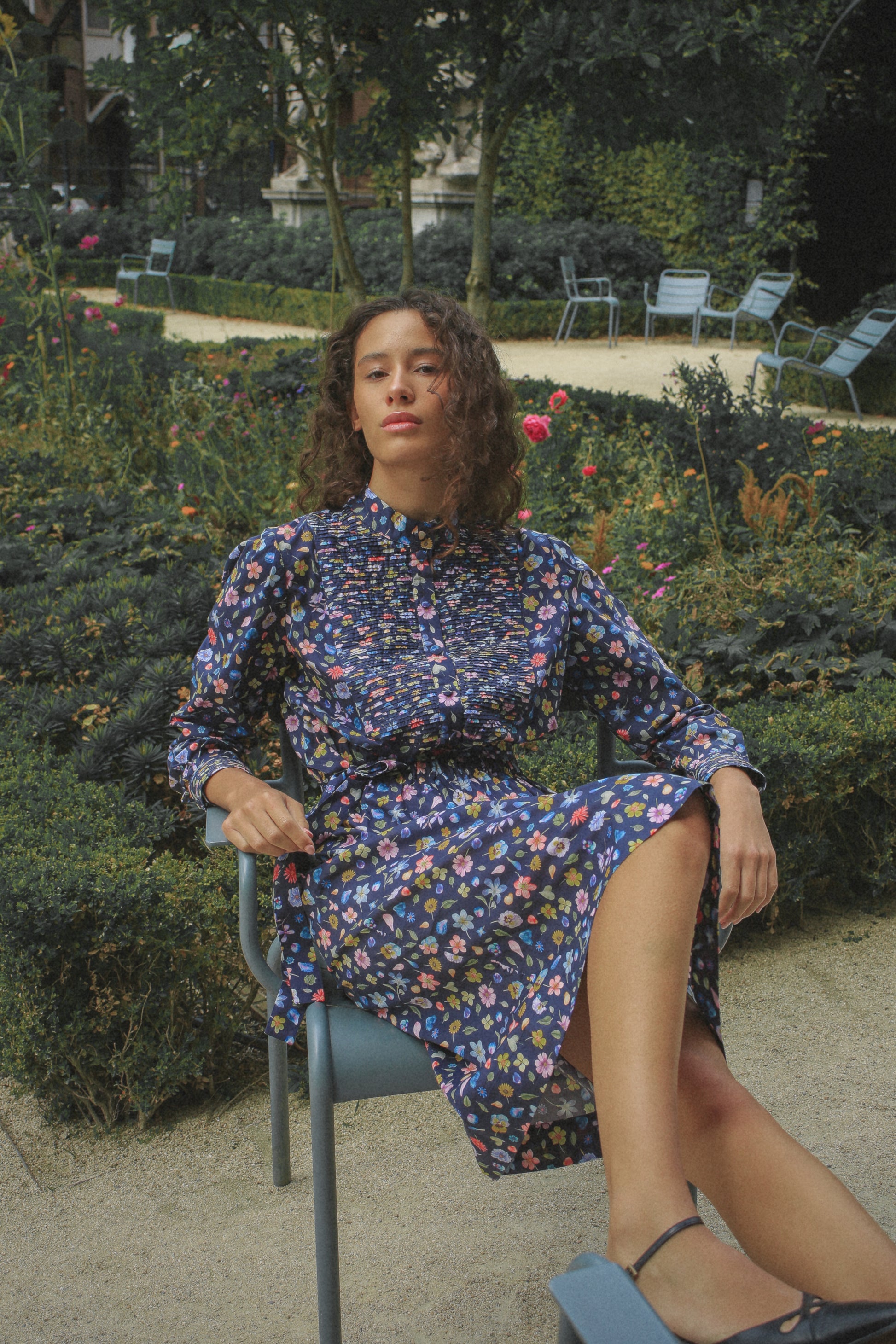 Tania dress, named after the brand's creator, stands as our most heartfelt piece. Drawing inspiration from the 70s, it radiates modest elegance and warm charm. Crafted from airy cotton poplin adorned with floral prints and decorative folds, she is perfect for both urban strolls and serene picnics amidst nature.