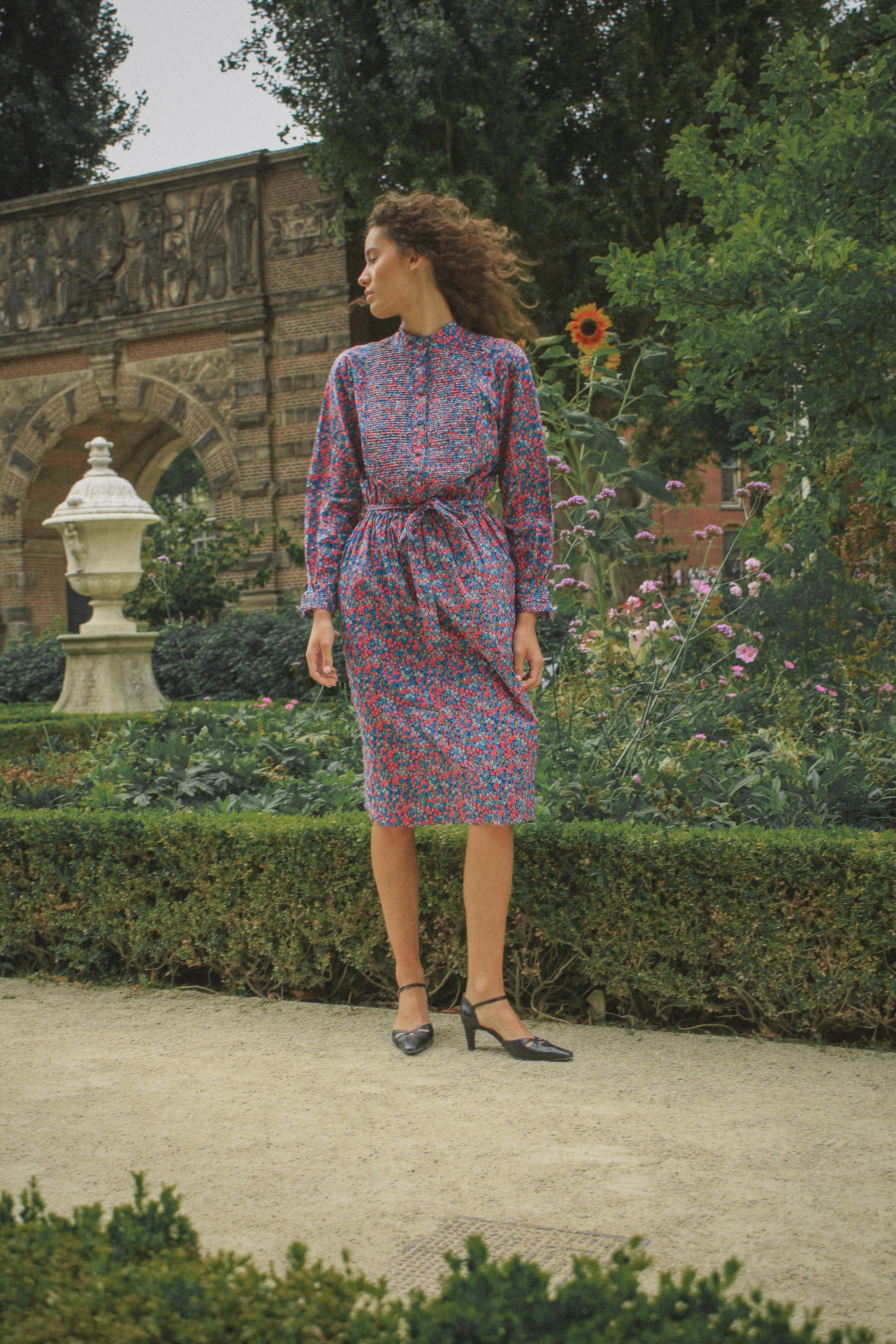 Tania dress, named after the brand's creator, stands as our most heartfelt piece. Drawing inspiration from the 70s, it radiates modest elegance and warm charm. Crafted from airy cotton poplin adorned with floral prints and decorative folds, she is perfect for both urban strolls and serene picnics amidst nature.